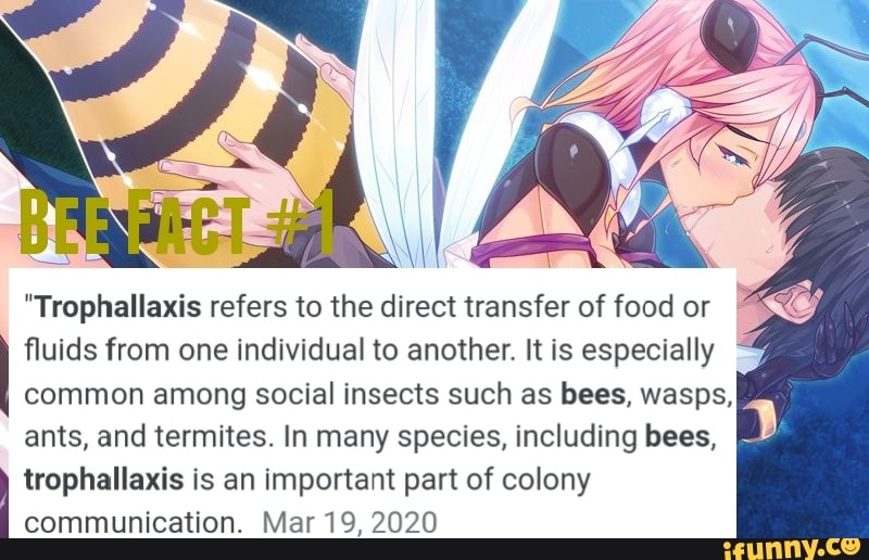 Trophallaxis () is the transfer of food or other fluids among members of a community through mouth-to-mouth (stomodeal) or anus-to-mouth (proctodeal) feeding. Along with nutrients, trophallaxis can involve the transfer of molecules such as pheromones, organisms such as symbionts, and information to serve as a form of communication. Trophallaxis is used by some birds, gray wolves, vampire bats, and is most highly developed in eusocial insects such as ants, wasps, bees, and termites.